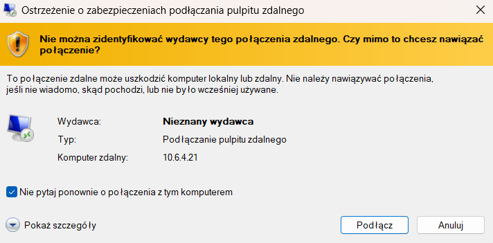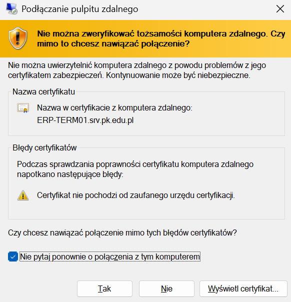 3. Zaznaczmy opcje „Nie pytaj ponownie o połączenie z tym komputerem” i potwierdzamy wybierając „Tak”: