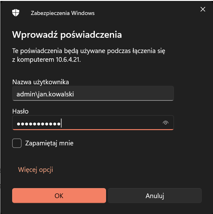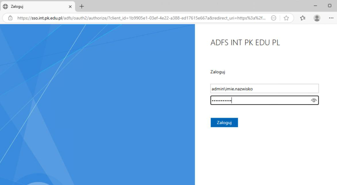 2. Na ekranie logowania podajemy login i hasło wg schematu (dane logowania do domeny admin.pk.edu.pl):
