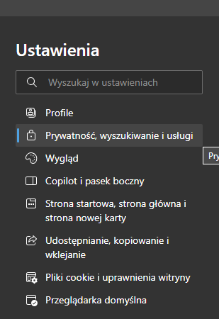 3. Wybieramy z menu po prawej stronie Prywatność, wyszukiwanie i usługi