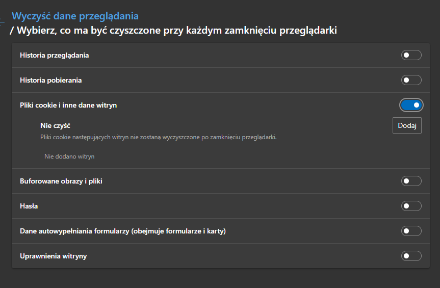4. Z okna środkowego klikamy Wyczyść dane przeglądania przy zamknięciu
