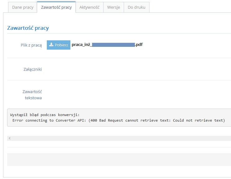 W zakładce "Zawartość pracy" pojawia się komunikat "Wystąpił błąd podczas konwersji: Error connecting to Converter API: (400 Bad Request cannot retrieve text: Could not retrieve text)".