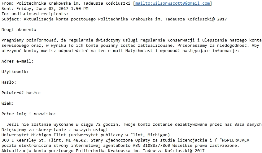 - Nie ufać spamowym listom nieudolnie przetłumaczonym na polski przez automat, jak w powyższym przykładzie.
